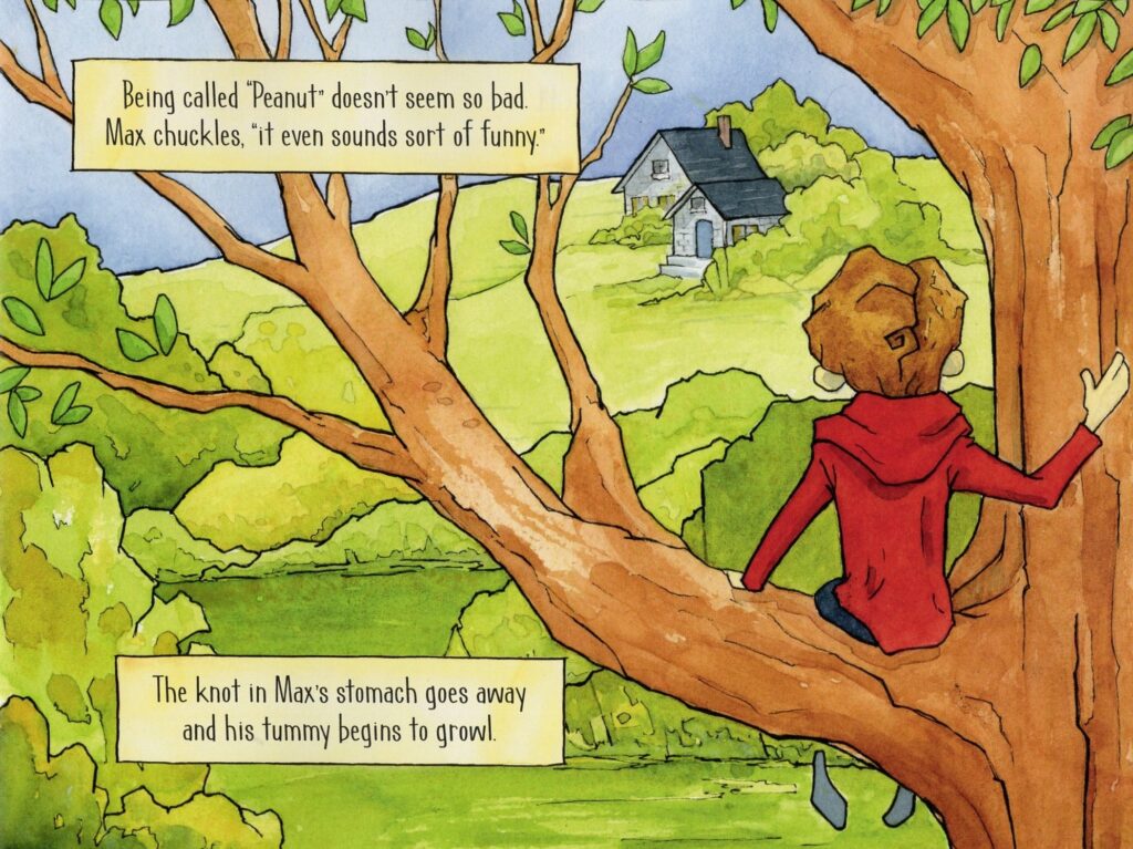 Max is a young man who lives with his grandmother. He is unhappy and upset, so he goes for a walk. His dad is in the army and his mom is a busy nurse. He is at a new school where kids make fun of his name. He wants to fly back to his old home and school. He wishes for someone to talk to. He sits down in the woods and his feelings come pouring out. Suddenly he hears from an old tree about deep roots and things always coming back. It’s his own tree for listening and for coming back. Max begins to feel better, his troubles seem smaller, and he plans to bring his family back to listen. Everyone can find their own listening tree. Or plant one.